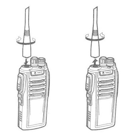 - Ăng-ten bộ đàm dùng để thu phát tín hiệu radio truyền đi khi đàm thoại. Xoay theo chiều kim đồng hồ để lắp, xoay ngược để tháo.