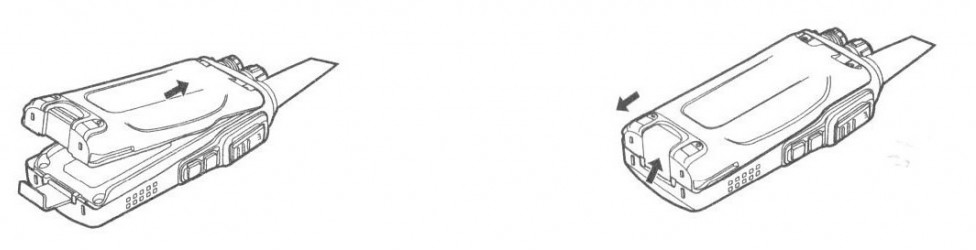 - Lắp pin bộ đàm để cung cấp năng lượng cho bộ đàm hoạt động. Làm theo chiều mũi tên hướng dẫn, bát đầu từ ảnh bên trái.
